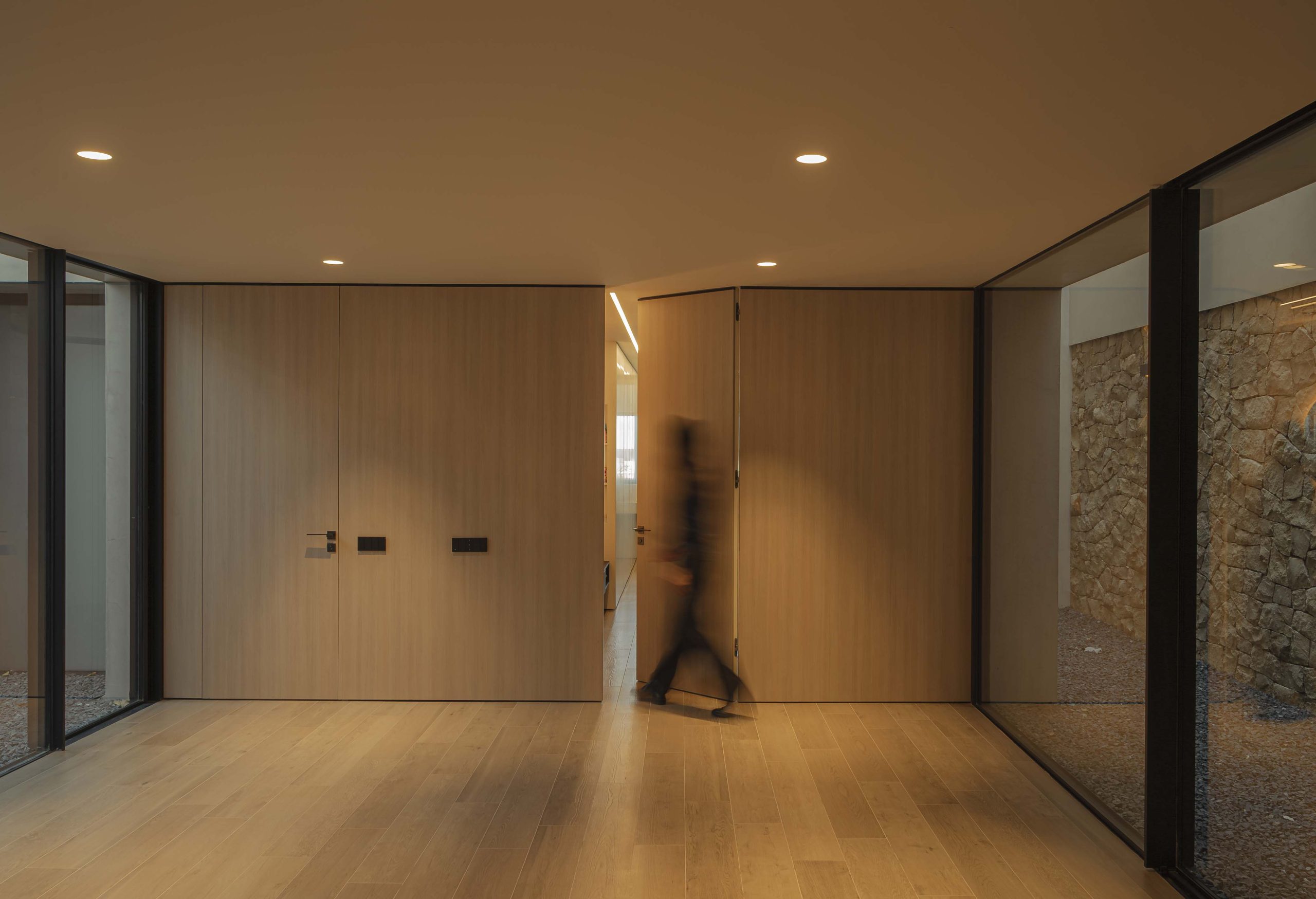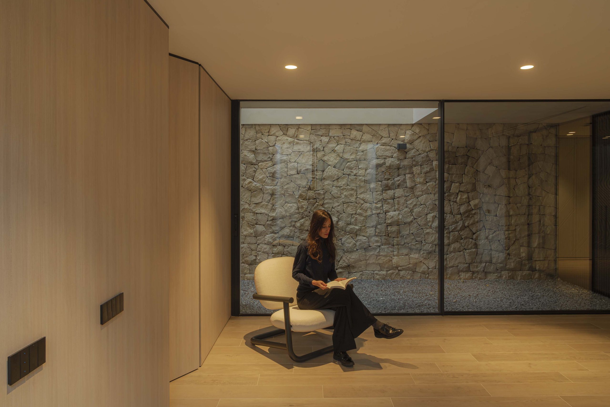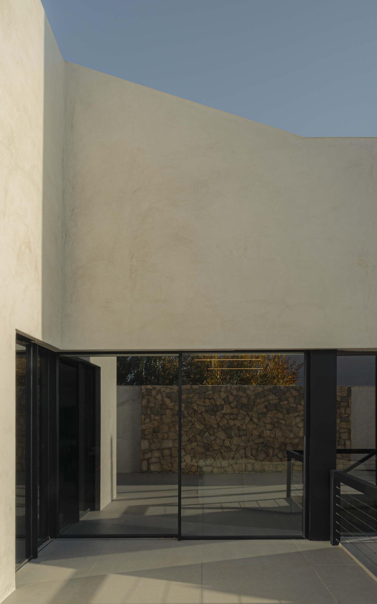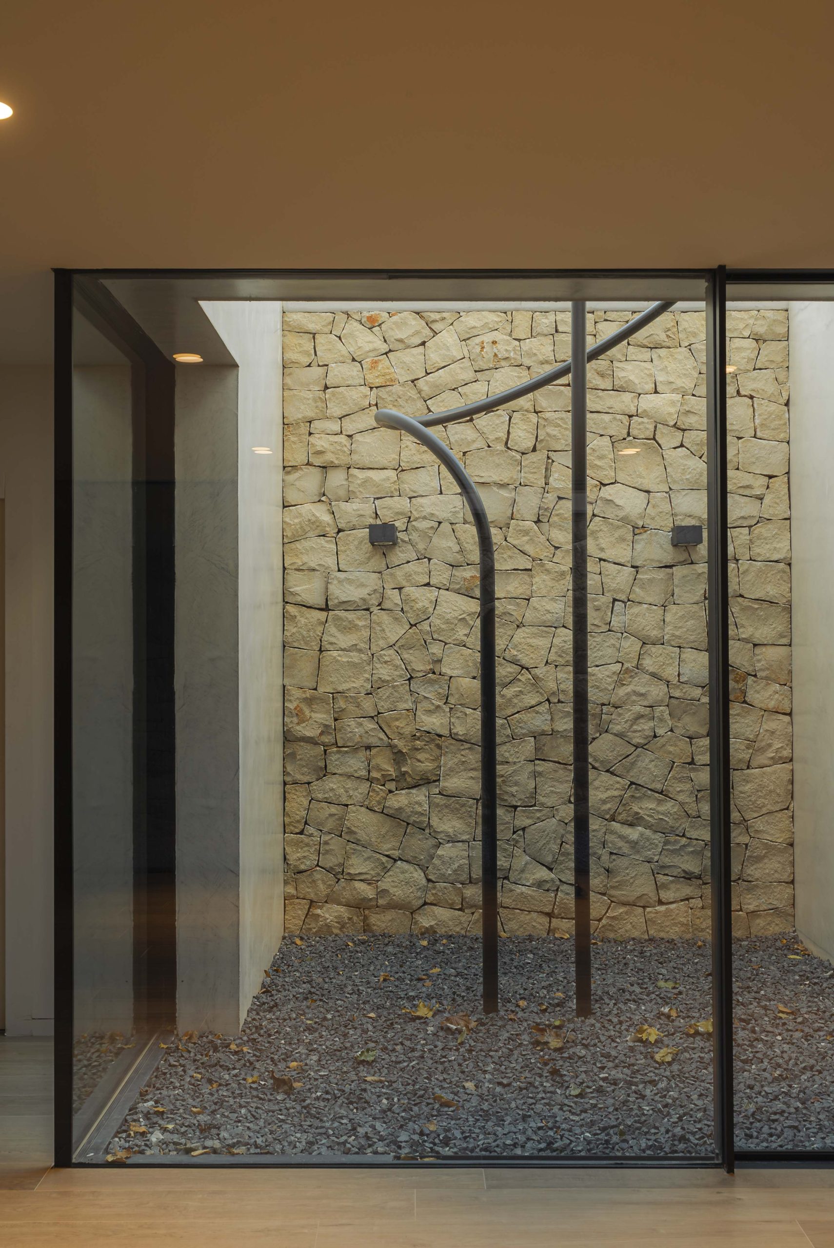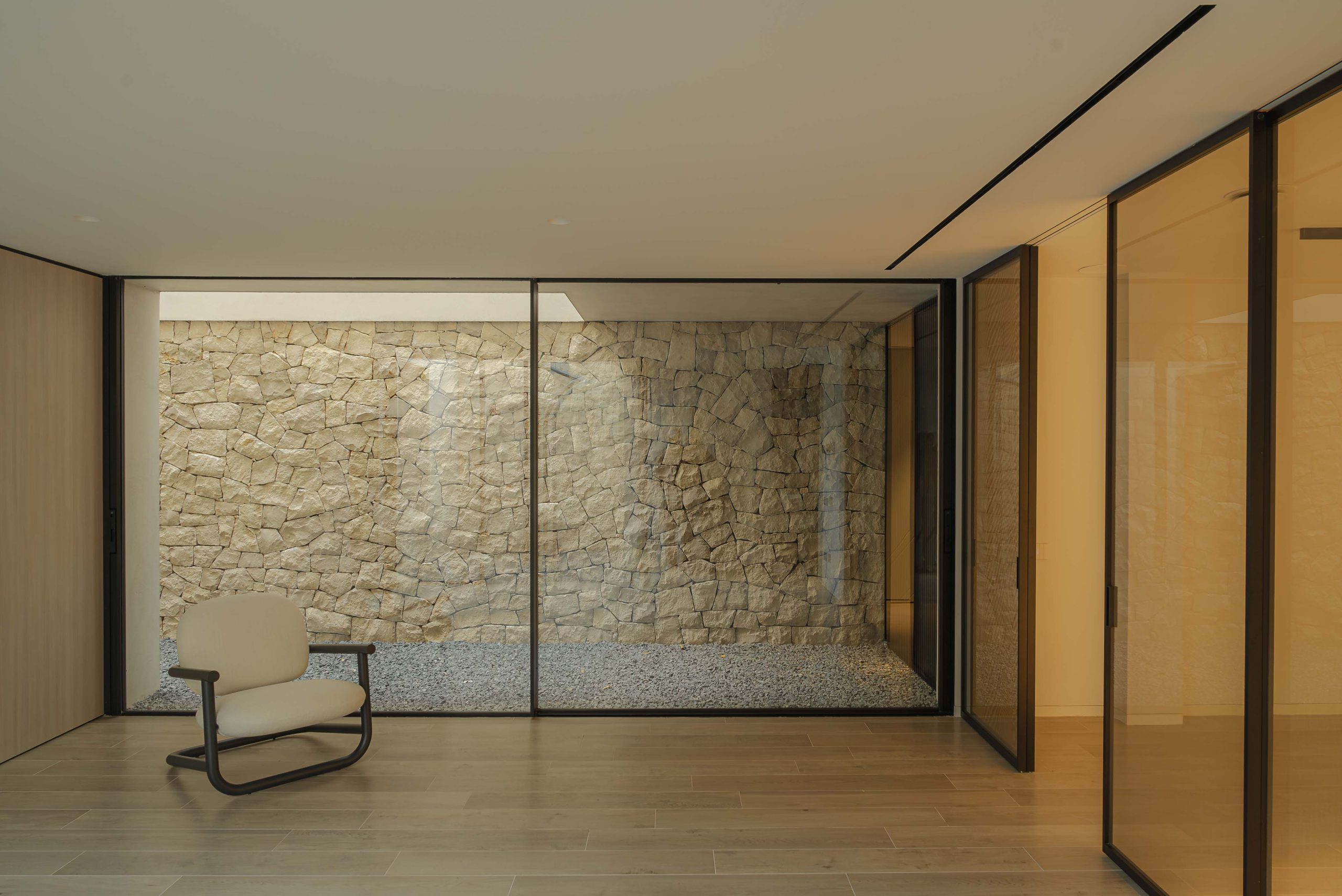 El lenguaje austero y ambiguo del exterior, empleado como solución amable con el contexto y como recurso para aislar acústica y visualmente la casa, muda hacia una narración más expresiva en el interior. Distribuida en tres plantas y con un total de 512 m2, la vivienda posee un interior sereno y confortable, luminoso y amplio para disfrutar de paseos a cobijo. Su apertura hacía los montes ofrece una visual única cargada de fuerza, mientras tres patios interiores tratados con piedra en seco en contraste con el revestimiento principal de microcuarzo, sirven de apoyo como fuente de luz y ventilación.