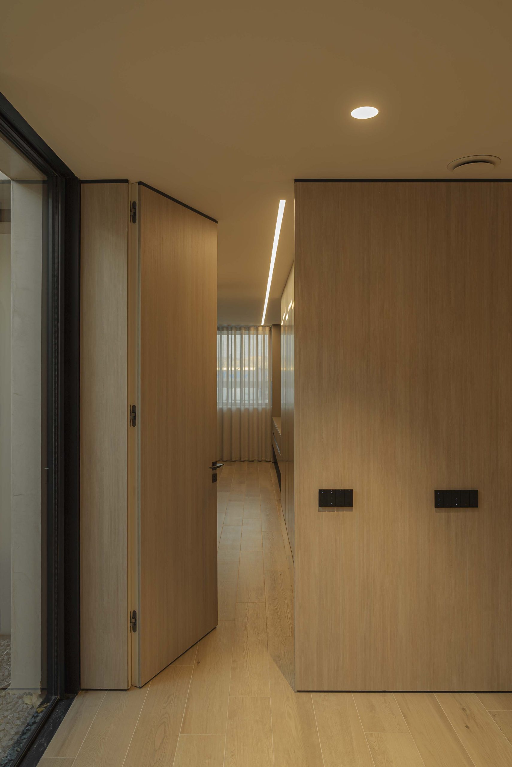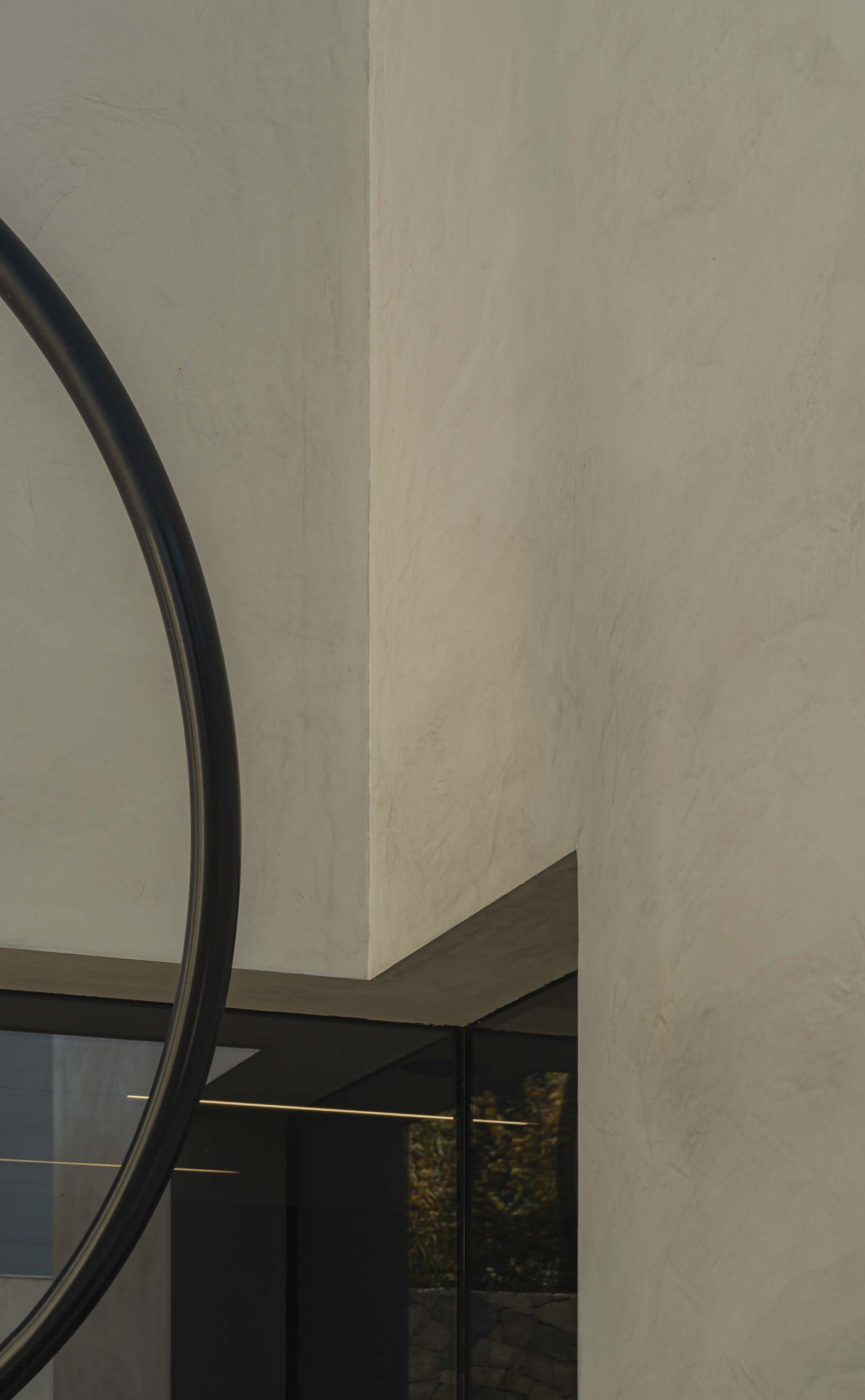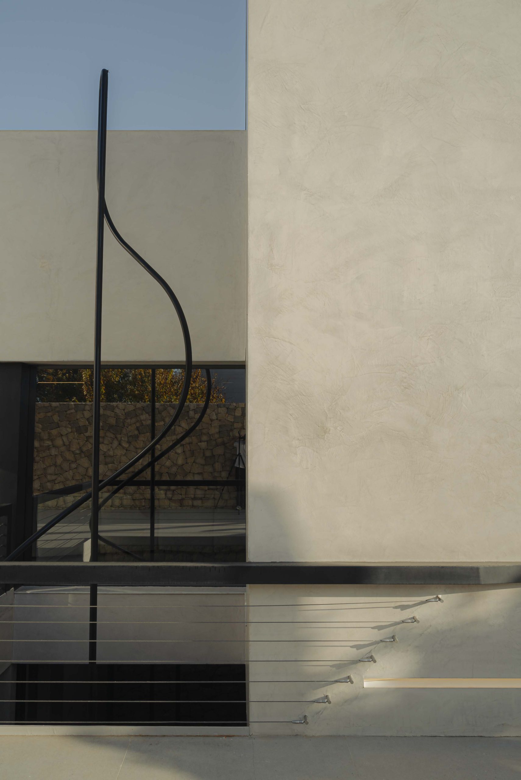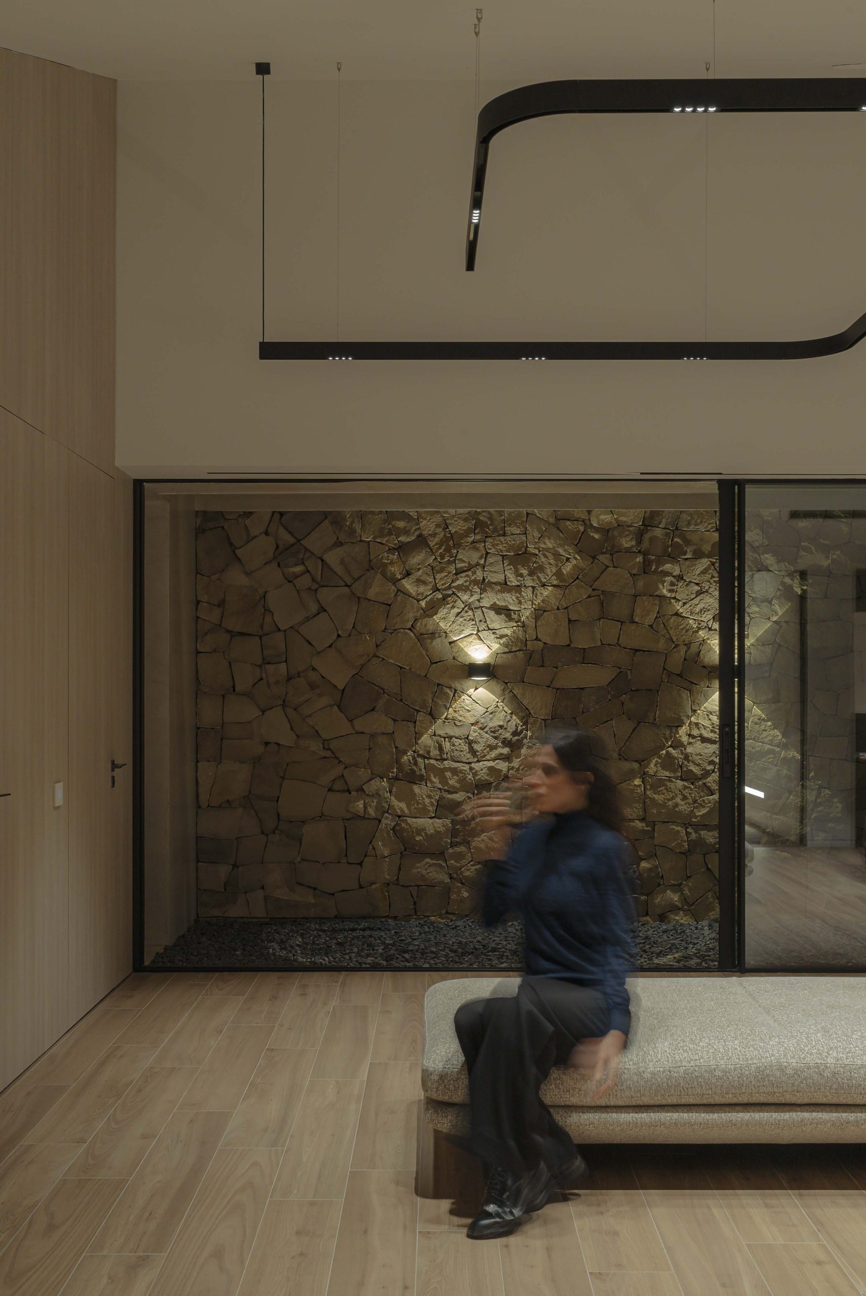 El lenguaje austero y ambiguo del exterior, empleado como solución amable con el contexto y como recurso para aislar acústica y visualmente la casa, muda hacia una narración más expresiva en el interior. Distribuida en tres plantas y con un total de 512 m2, la vivienda posee un interior sereno y confortable, luminoso y amplio para disfrutar de paseos a cobijo. Su apertura hacía los montes ofrece una visual única cargada de fuerza, mientras tres patios interiores tratados con piedra en seco en contraste con el revestimiento principal de microcuarzo, sirven de apoyo como fuente de luz y ventilación.