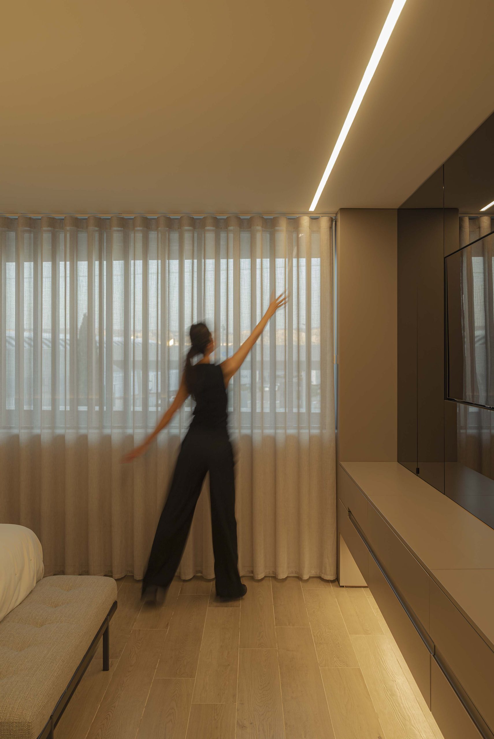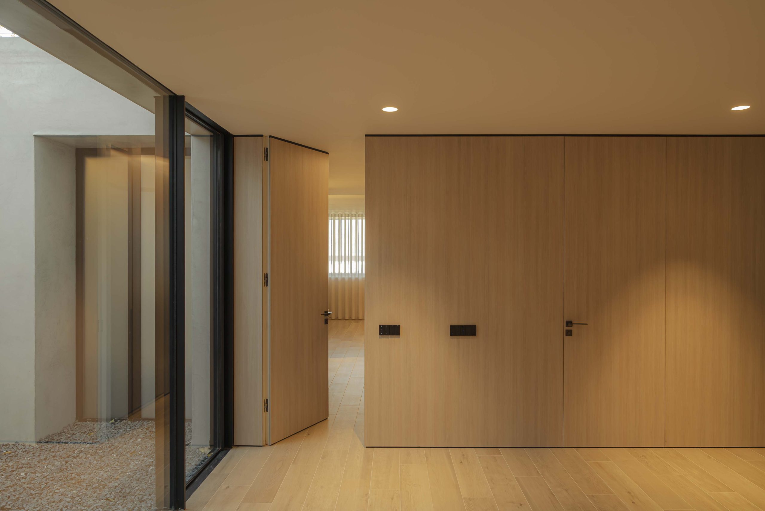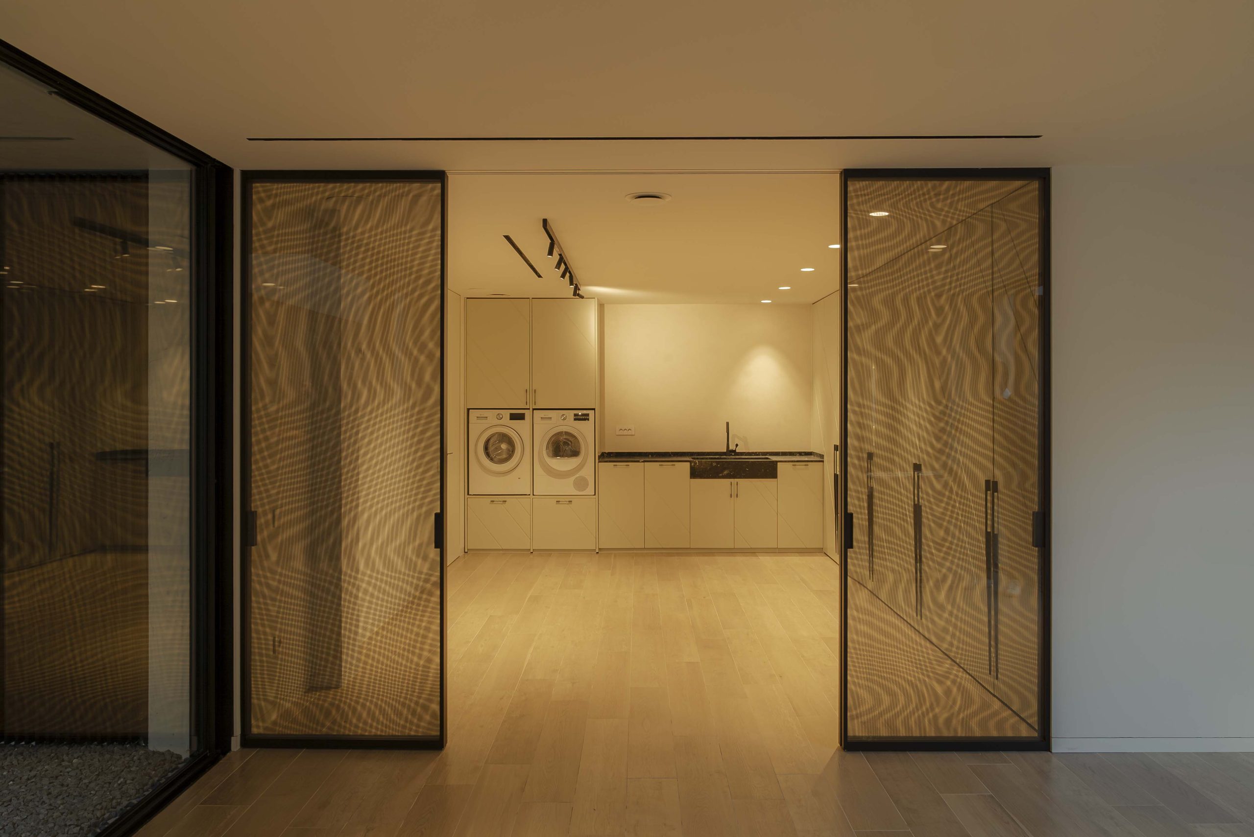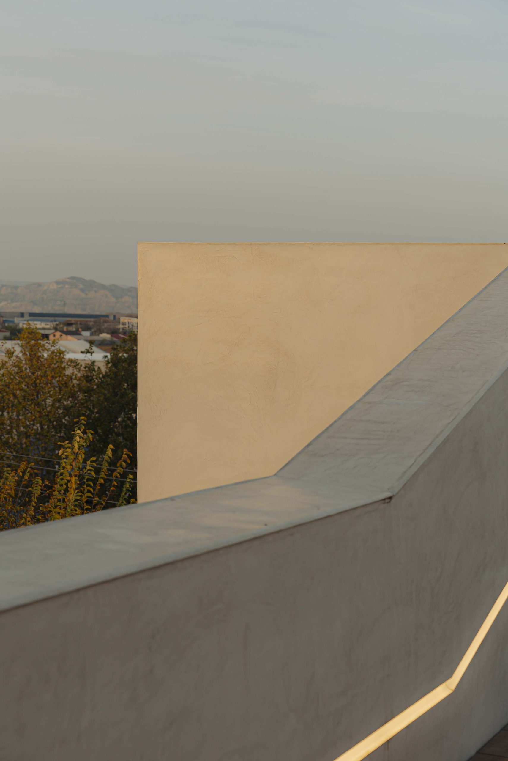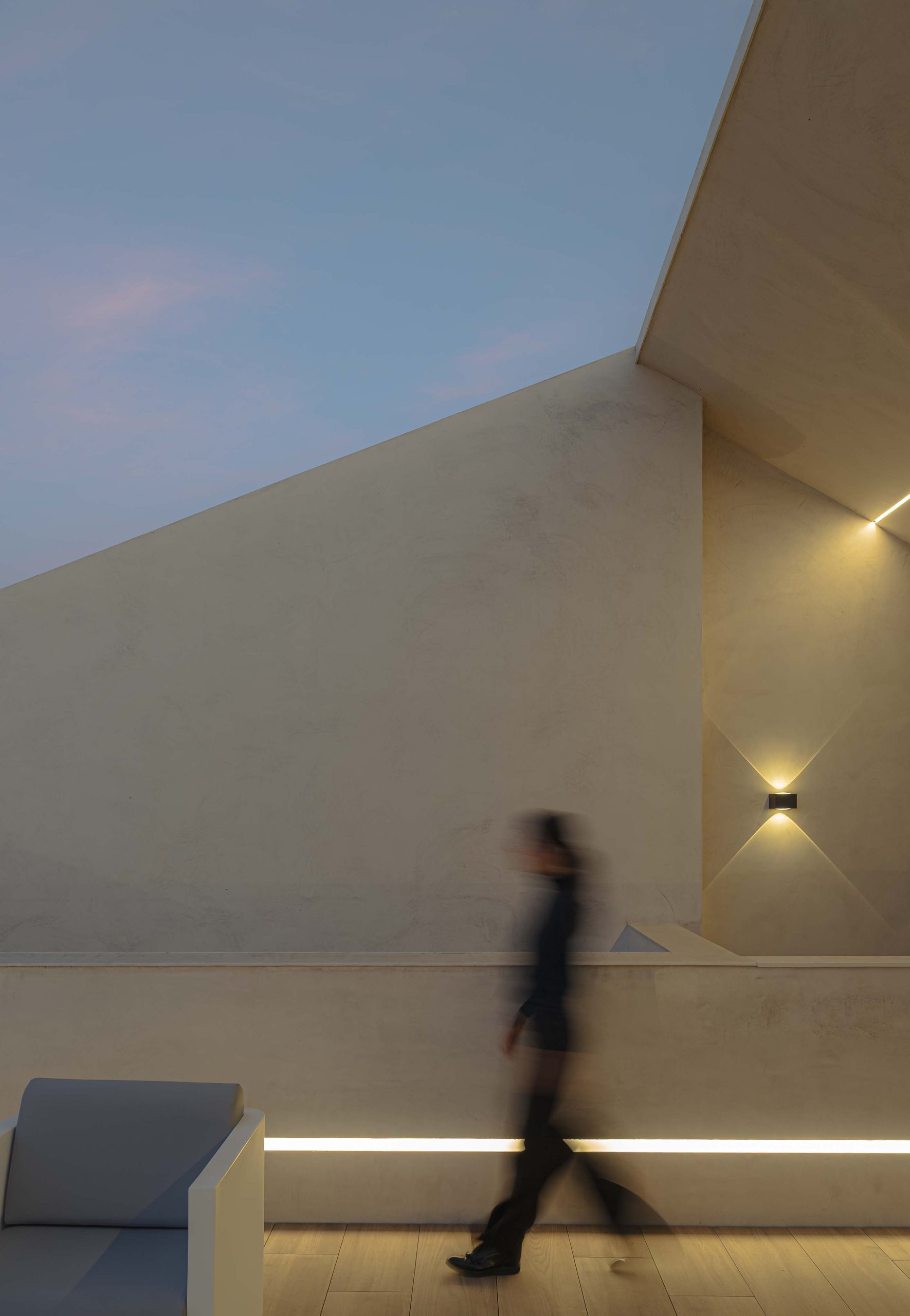 El lenguaje austero y ambiguo del exterior, empleado como solución amable con el contexto y como recurso para aislar acústica y visualmente la casa, muda hacia una narración más expresiva en el interior. Distribuida en tres plantas y con un total de 512 m2, la vivienda posee un interior sereno y confortable, luminoso y amplio para disfrutar de paseos a cobijo. Su apertura hacía los montes ofrece una visual única cargada de fuerza, mientras tres patios interiores tratados con piedra en seco en contraste con el revestimiento principal de microcuarzo, sirven de apoyo como fuente de luz y ventilación.
