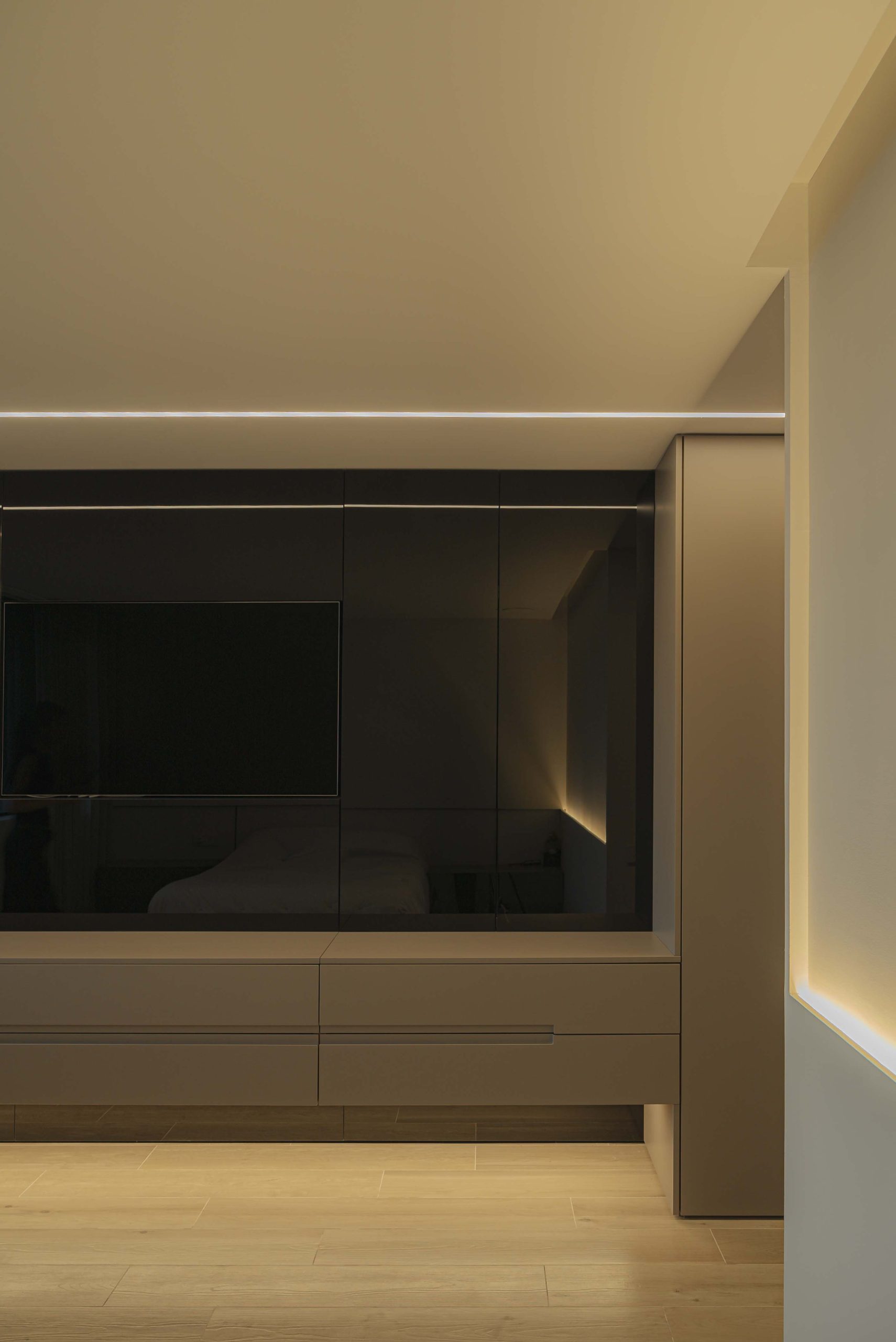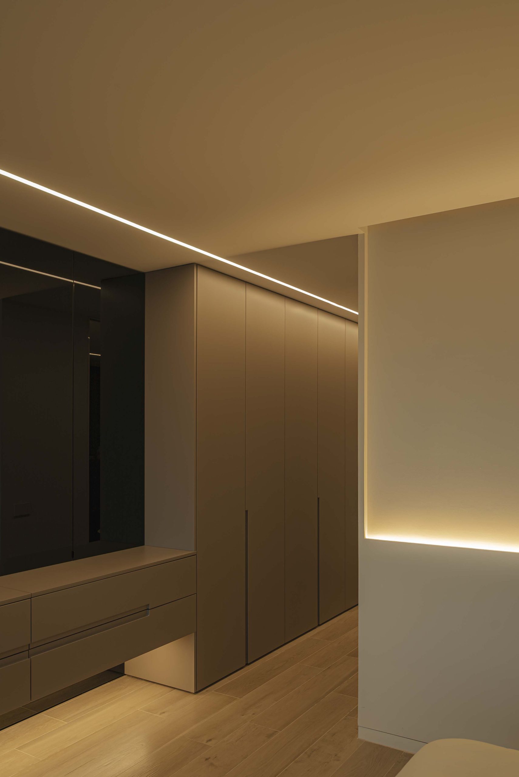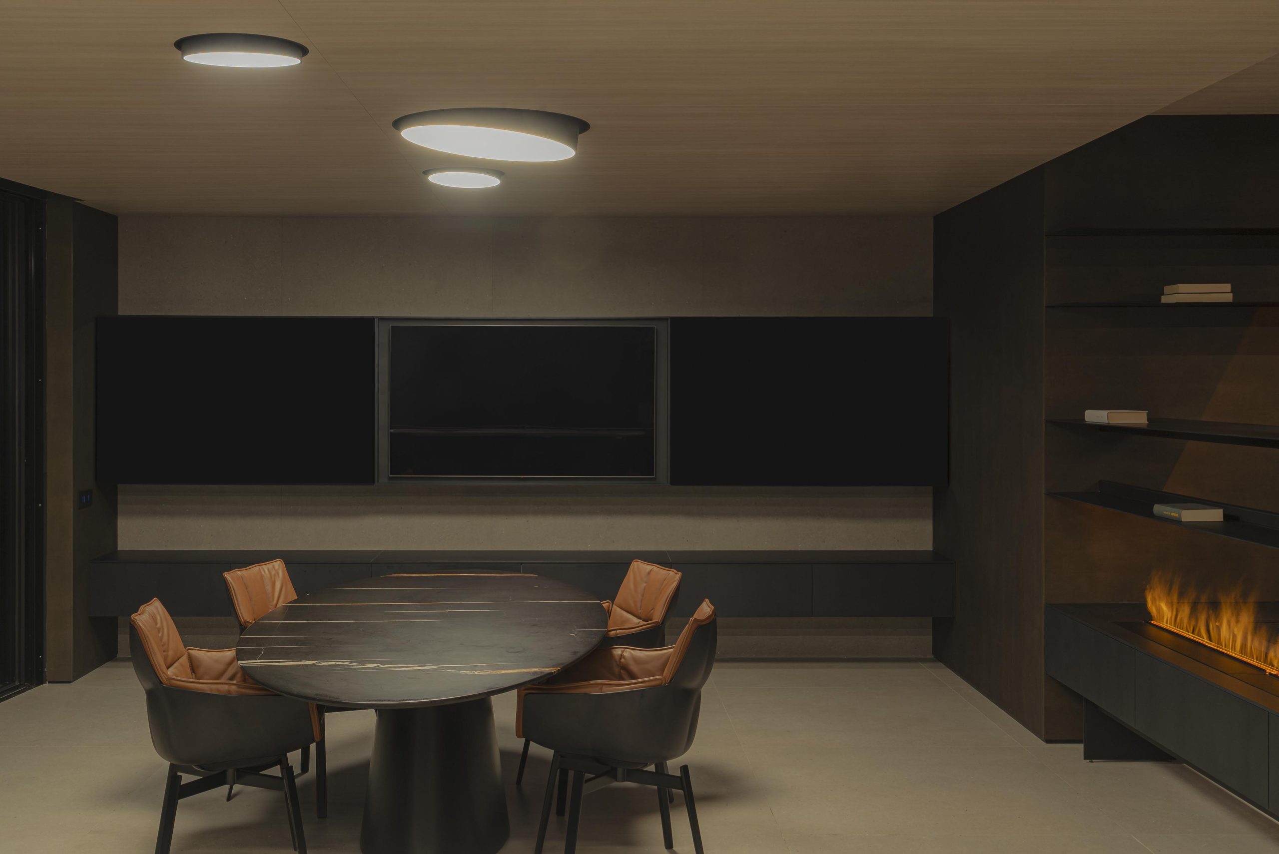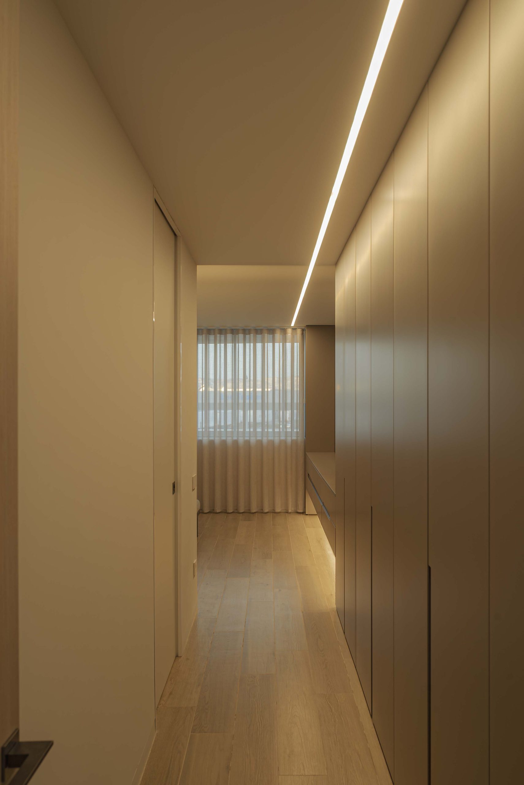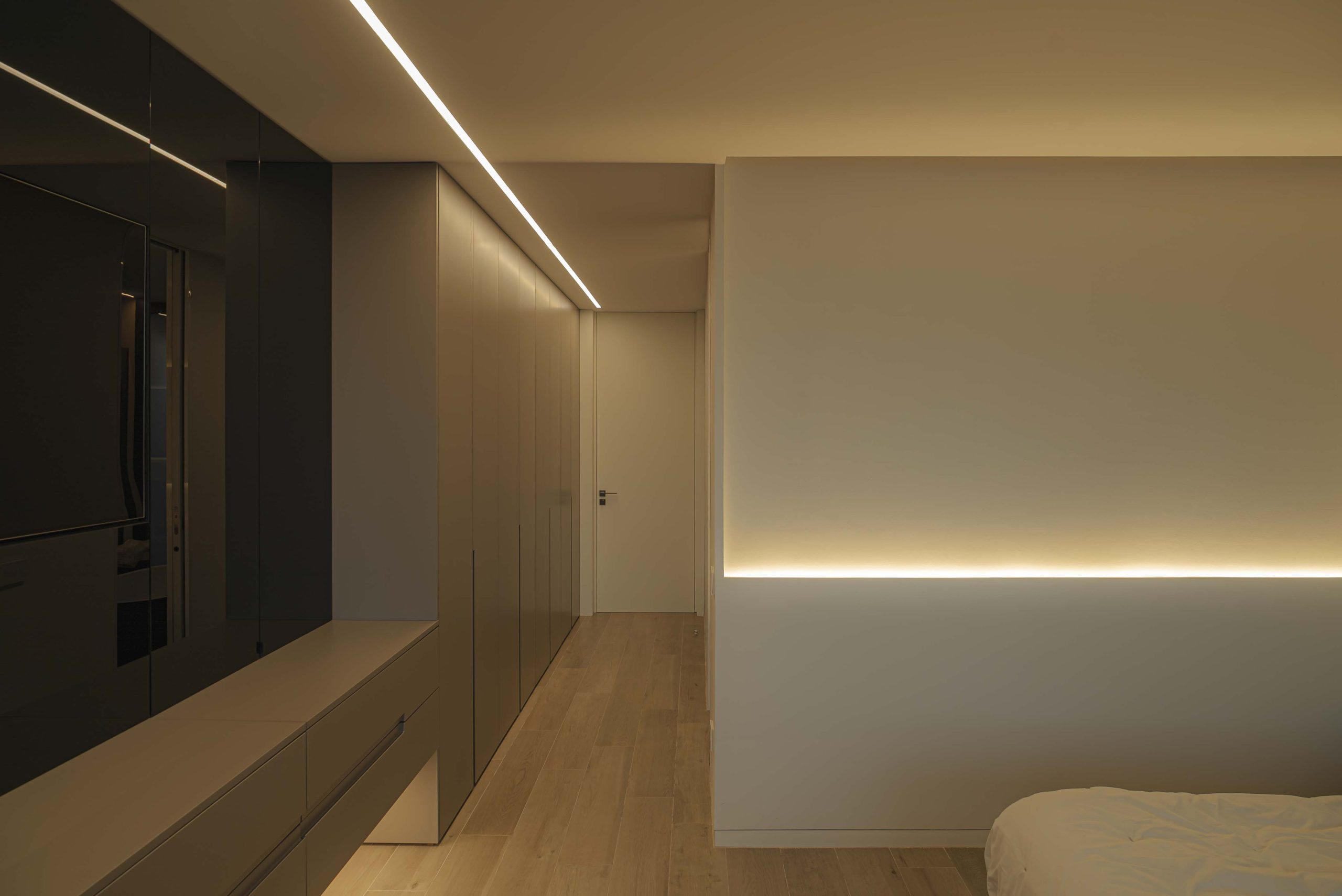 El lenguaje austero y ambiguo del exterior, empleado como solución amable con el contexto y como recurso para aislar acústica y visualmente la casa, muda hacia una narración más expresiva en el interior. Distribuida en tres plantas y con un total de 512 m2, la vivienda posee un interior sereno y confortable, luminoso y amplio para disfrutar de paseos a cobijo. Su apertura hacía los montes ofrece una visual única cargada de fuerza, mientras tres patios interiores tratados con piedra en seco en contraste con el revestimiento principal de microcuarzo, sirven de apoyo como fuente de luz y ventilación.