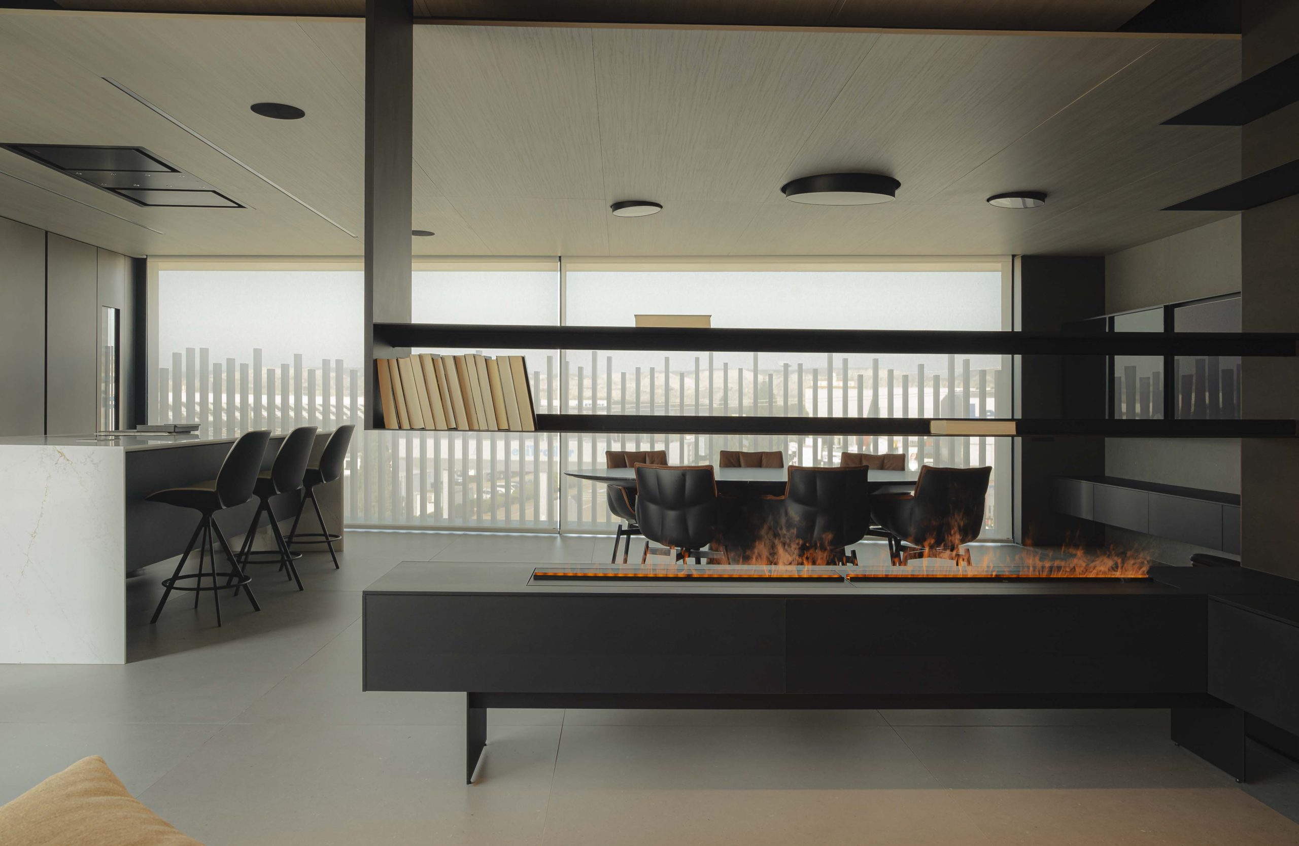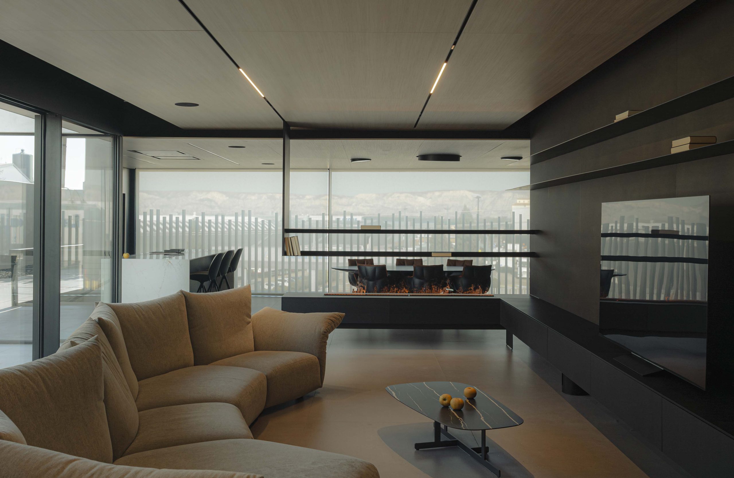 La zona de día en planta baja se trata como un escenario diáfano, sin pilares y abierto al horizonte mediante una cristalera que recorre el frontal protegida por la característica celosía. En esta estancia destaca el diseño ligero de la chimenea, la geométrica isla de cocina y el mueble televisor con finos estantes de hierro de 6 metros de longitud.