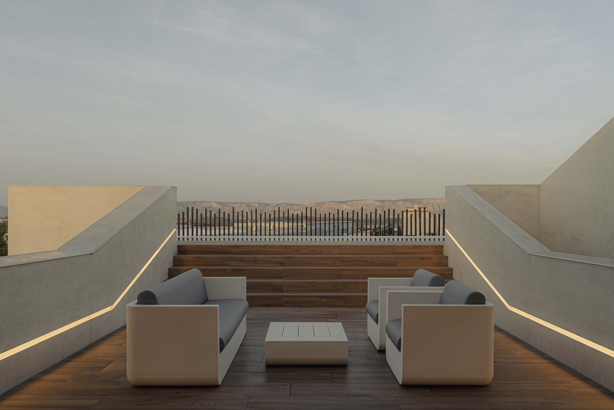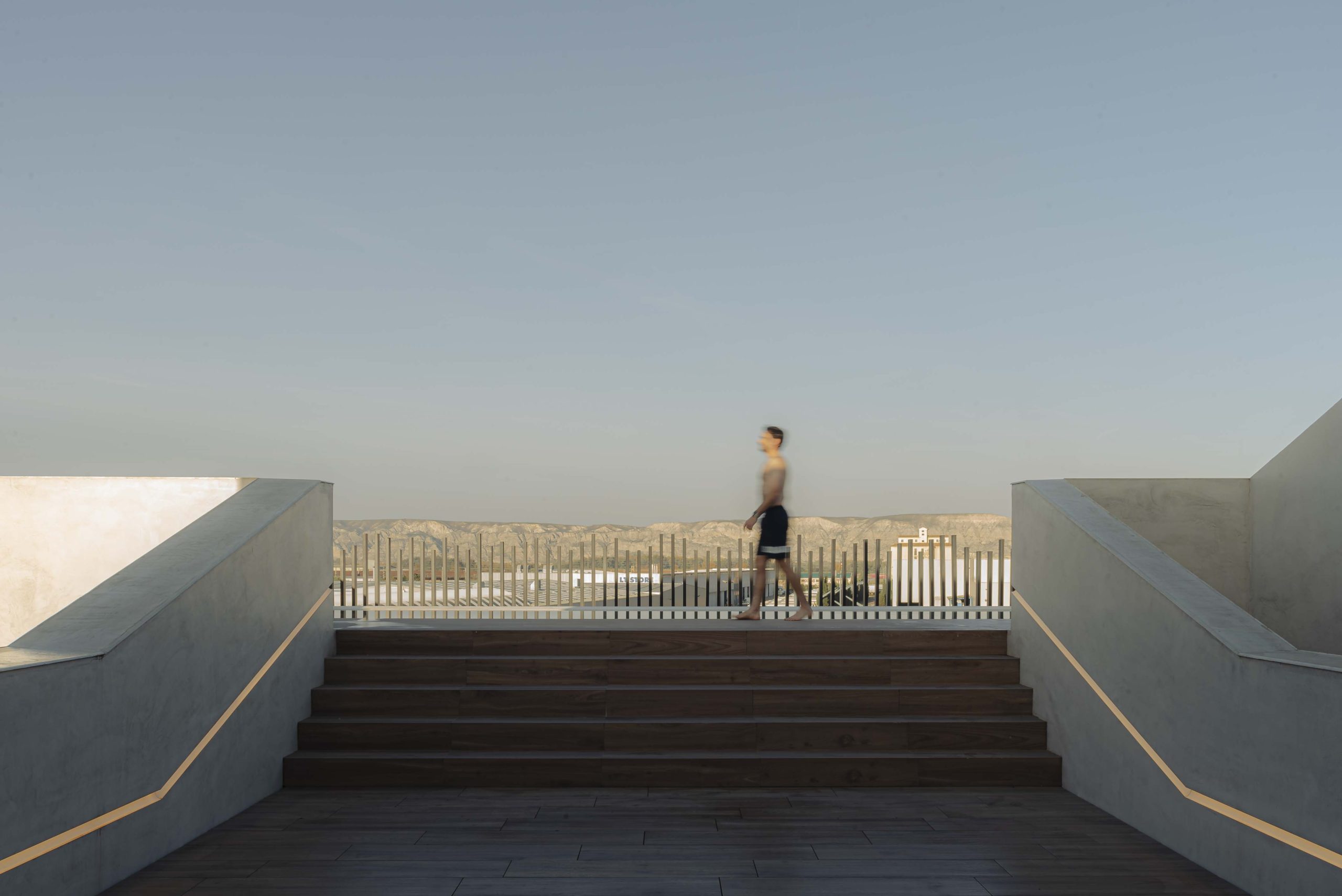 La planta primera se destina al ocio con una sala de estar arropada por una generosa terraza y el tercer patio, oculto en la cara posterior de la fachada principal, que proporciona iluminación y ventilación cruzada sin abrir huecos a la calle. La terraza culmina en una piscina desbordante elevada un metro de altura sobre el resto de la planta, para potenciar la belleza de las vistas.