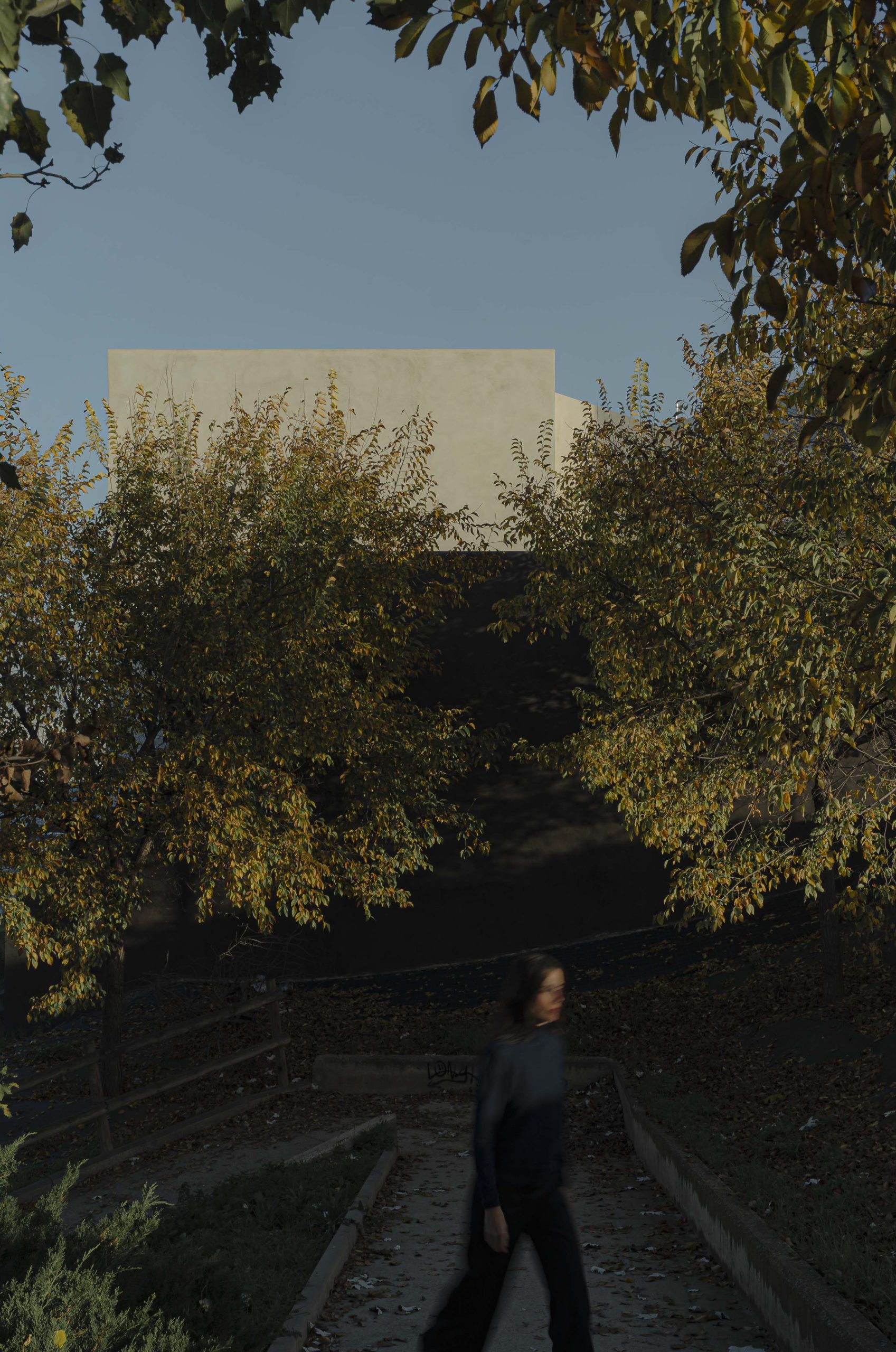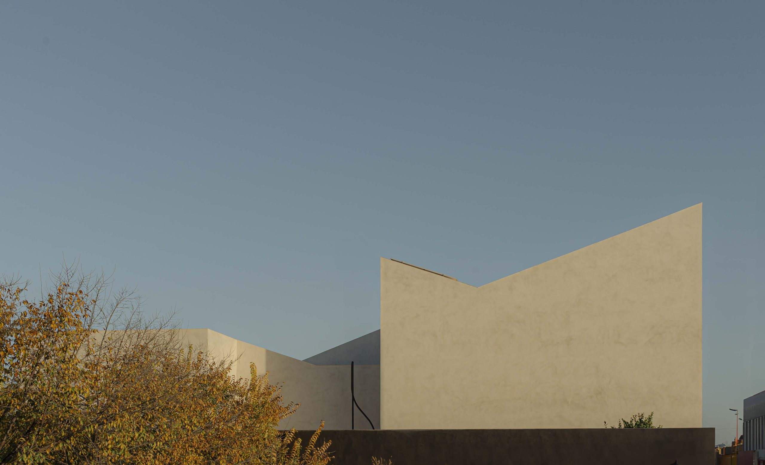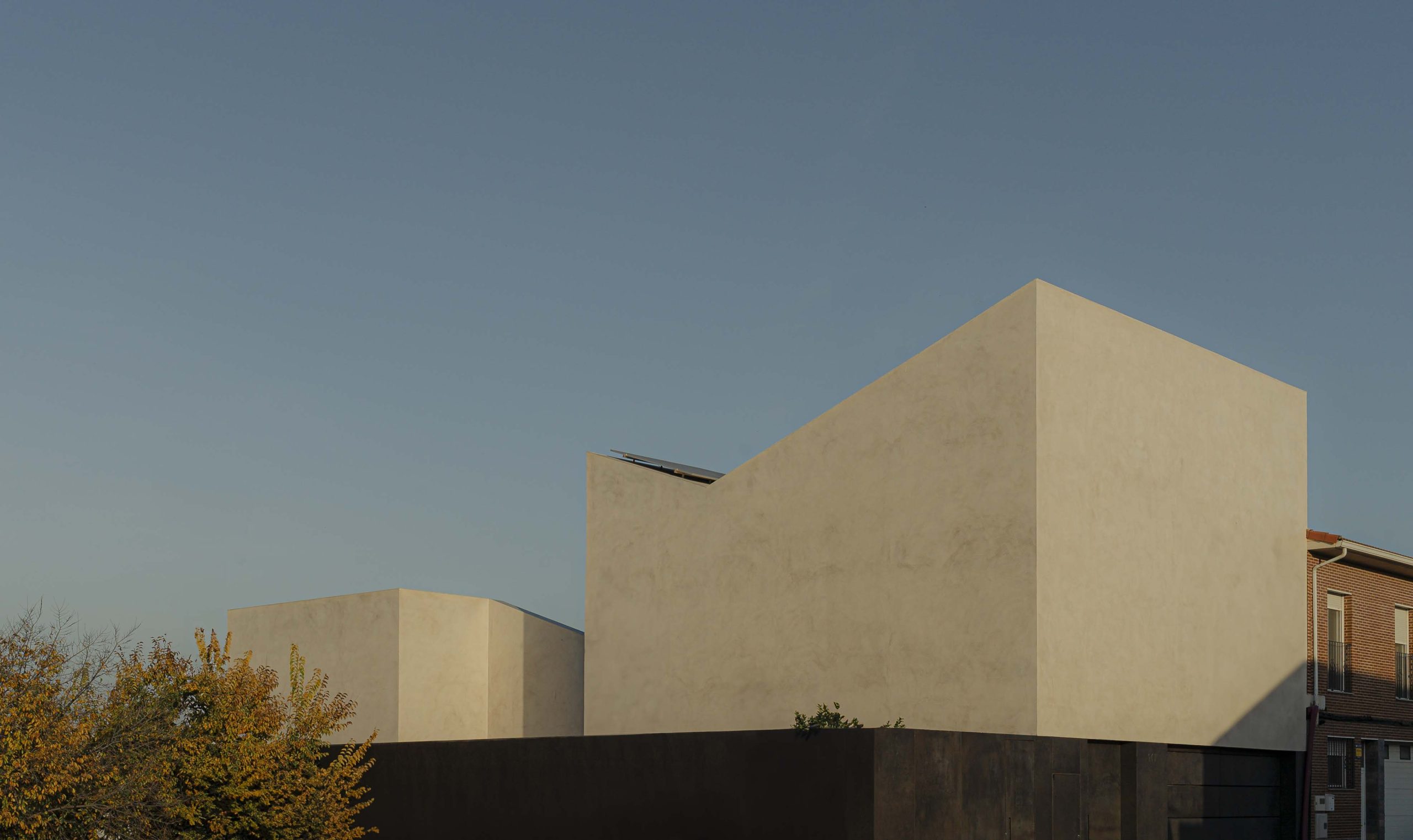 Acorde a la morfología industrial, la vivienda se presenta como un bloque hermético de cubiertas invertidas, vestido de un revestimiento continuo que recuerda la piel de una escultura. Diseñada sobre una parcela con desnivel, la casa dirige su mirada hacia un horizonte representado por los montes del Castellar, a orillas del Ebro. La fachada principal rompe con la voluntad de relación social propia de la arquitectura residencial y se aísla manifestándose como un telón ciego rectangular. Sus únicas aperturas son los accesos enmarcados en una franja negra que funciona como base del monolito.