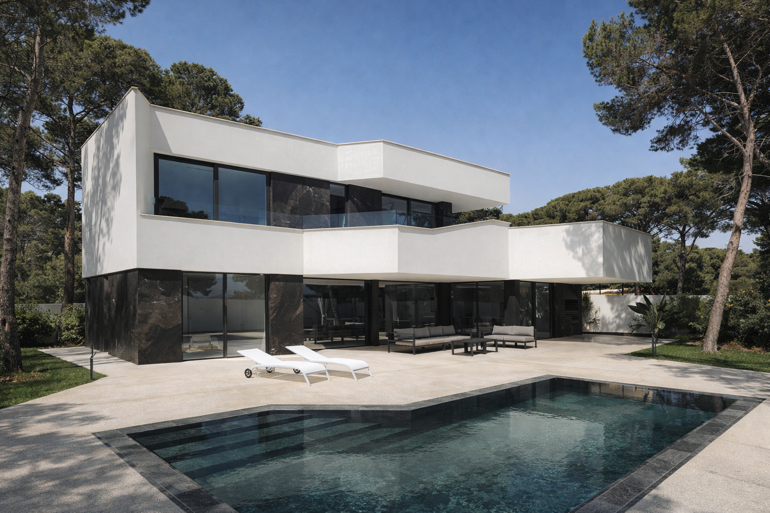 Situada en una parcela de pinar en Valencia, esta casa moderna en Valencia plantea una arquitectura que, desde la abstracción geométrica, se adapta al lugar y refuerza su condición cambiante. La composición se organiza mediante bandejas horizontales desplazadas que se deslizan entre los pinos, configurando un volumen fragmentado que establece un equilibrio entre materia, geometría y paisaje.