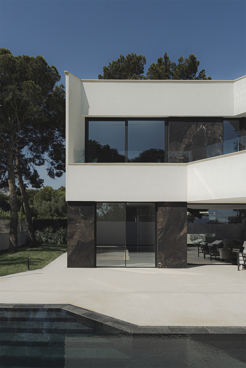 La composición se articula mediante planos horizontales que se desplazan y quiebran, configurando una secuencia en zigzag que introduce una lectura dinámica del volumen. Estas líneas diagonales evocan el crecimiento irregular de las ramas y la condición cambiante de la naturaleza. Esta lógica geométrica se extiende a los pavimentos exteriores y a la piscina, reforzando la continuidad entre arquitectura y paisaje.