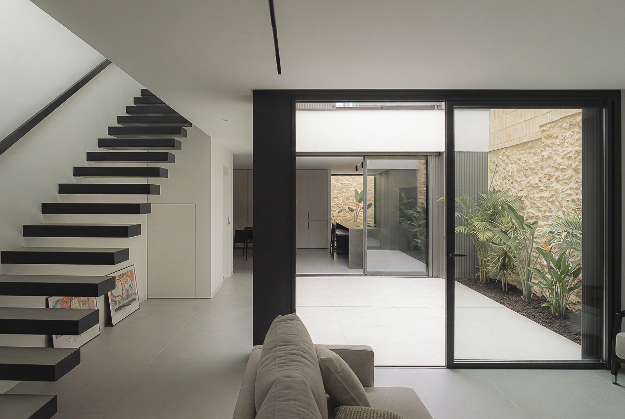 Los patios crean una amplia zona exterior dentro de casa y son fuente de luz natural y ventilación cruzada. La disposición norte de las estancias de la primera planta, favorece que los rayos de luz penetren hasta la planta baja.