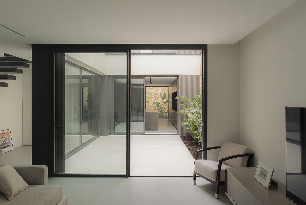 Emplazada en el corazón de la ciudad, esta casa patio entre medianeras se distribuye en dos alturas. La fachada exterior se concibe como un gran filtro o celosía que da al espacio público. Este elemento separa la terraza de la primera planta de la vía pública, con la suficiente opacidad para proteger la intimidad y la suficiente transparencia en sentido perpendicular para favorecer la relación con el entorno urbano permitiendo el paso de luz, ventilación e imagen filtrada. De este modo, se mantiene siempre la sensación de estar en un espacio exterior protegido, con un frente de fachada controlado, íntimo y no agobiante.