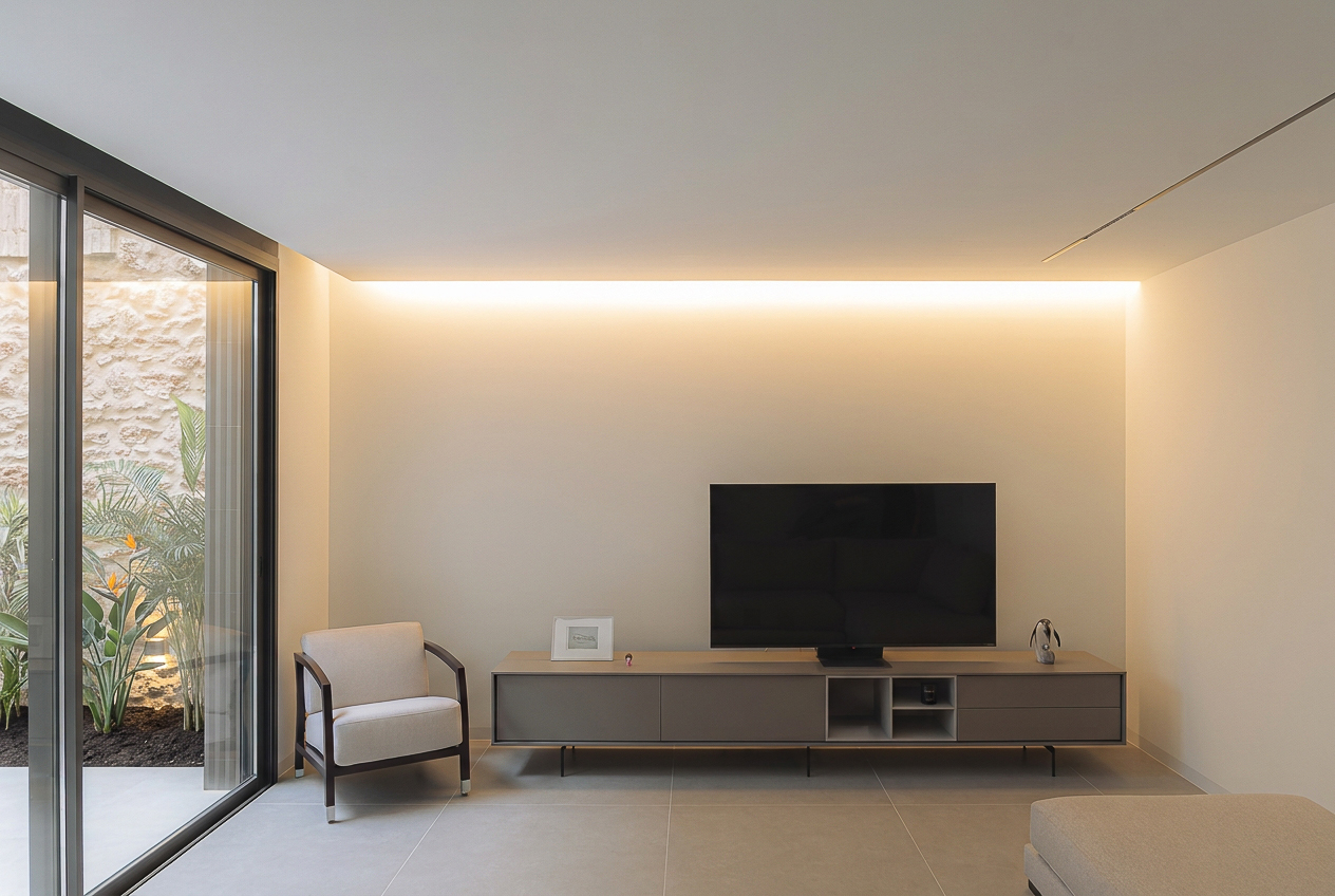En planta baja de esta casa patio en Moncada se dispone la mayor parte del programa en un espacio continuo y bien comunicado: la zona de día, que integra en un mismo ambiente salón, comedor, cocina y dos patios, y el garaje.