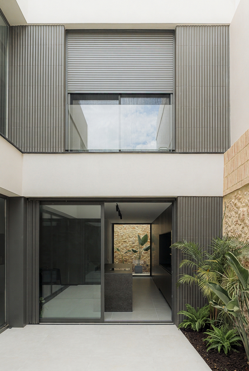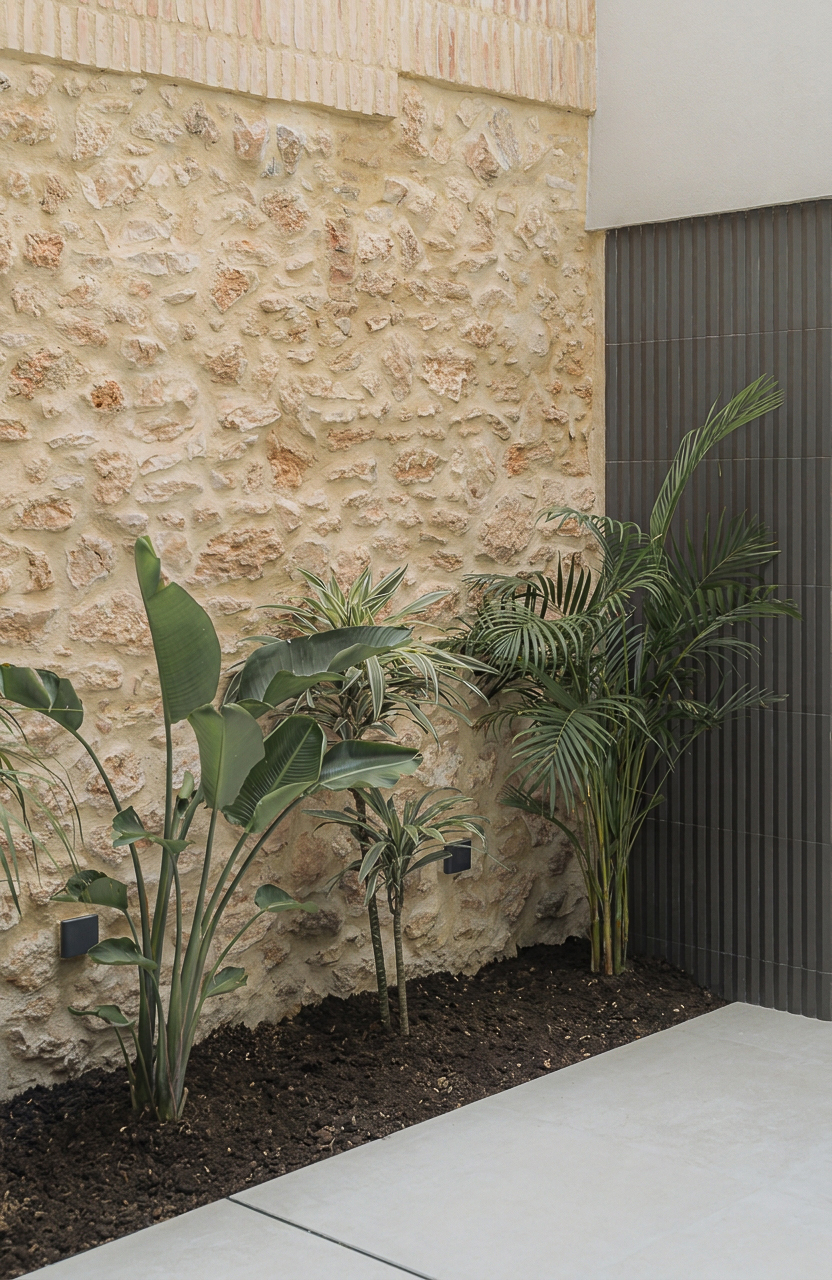 En los patios se ha tratado de forma intensa el motivo de la piedra mediante la recuperación de la piedra natural original, propia de los muros de carga de las viviendas tradicionales de pueblo. Esta piedra se deja al descubierto en ambos patios para poner en valor el elemento original del muro existente.