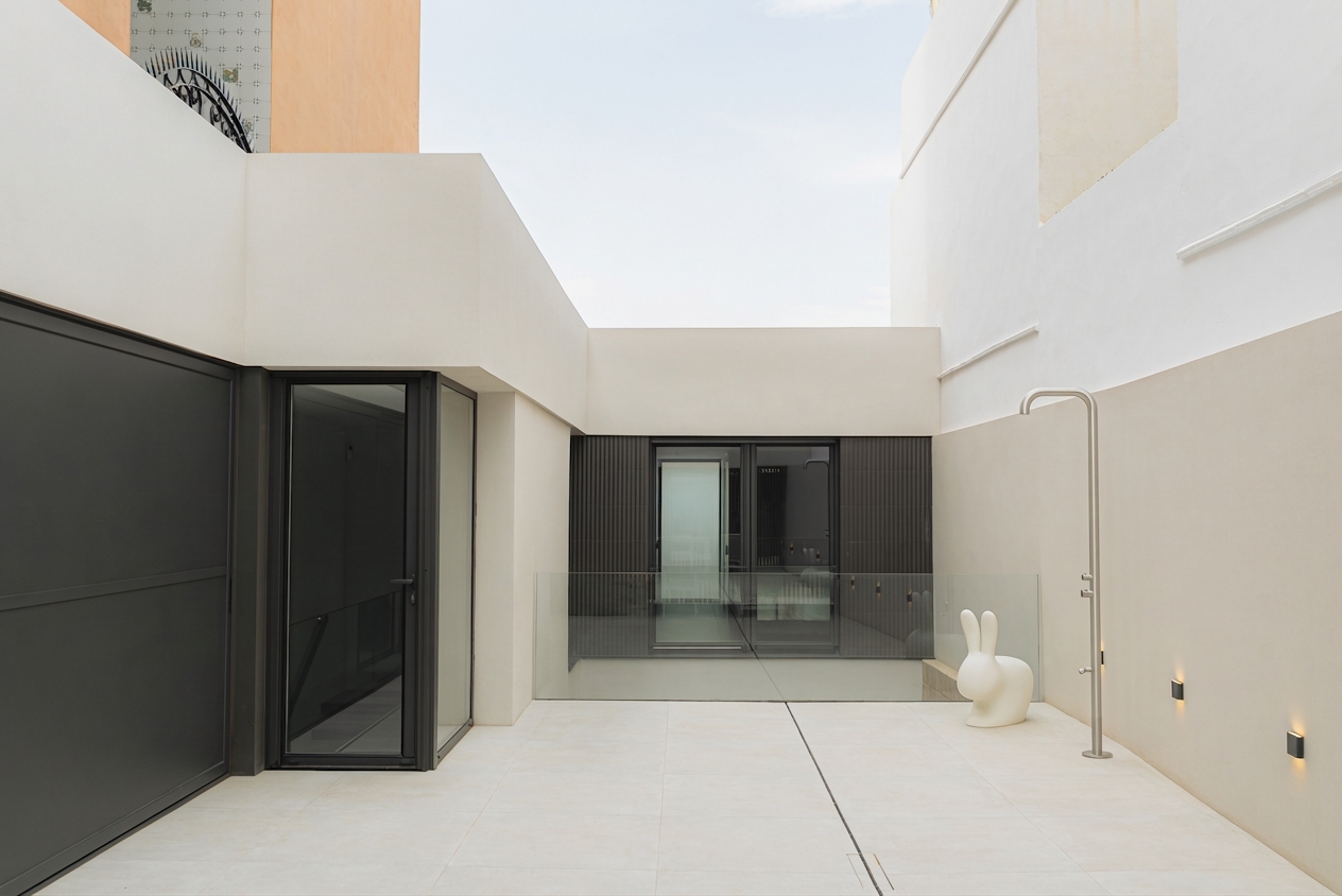 La planta superior de esta casa patio en Moncada se destina a la suite principal, un despacho y una terraza. Como un remanso en pleno centro urbano, la terraza está orientada al sur para recibir una gran cantidad de sol, mientras que las piezas más importantes se sitúan al norte. Está equipada una cocina exterior bajo una porchada que da sombra en los momentos más calurosos y una ducha de carácter escultórico.